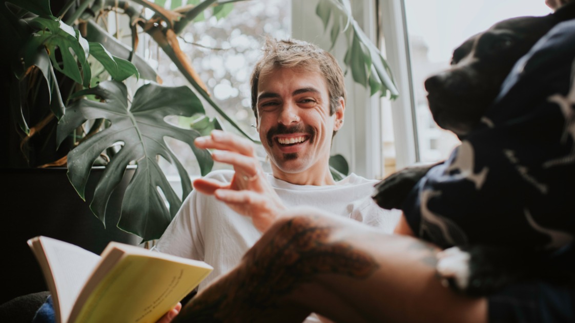 Person reading a book, joined by a dog